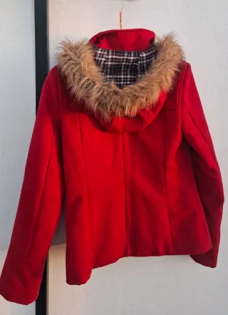 Abrigo corto forrado de color rojo, ideal para el frío. - Cierre de cremallera y botones. - Dos bolsillos delanteros. - Capucha con detalle de pelo.