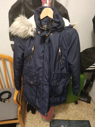 Abrigo tipo parka con capucha de pelo sintético. - Cierre de cremallera. - Bolsillos frontales con solapa y botón. - Cordón ajustable en la cintura. - Puños elásticos. Parka/abrigo/chaquetón nuevo con capucha de pelo.Talla S. Pull&Bear. Outerwear. Sin uso. De pelito por dentro. Aislante térmico. Numerosos bolsillos con botones o cremalleras. Regulable y ajustable. El pelo de la capucha se puede recoger si se prefiere, de forma que no queda visible. A estrenar. Color beige.