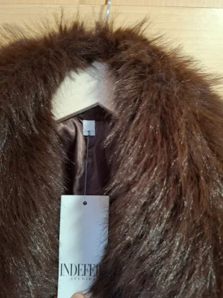 Elegante chaquetón de pelo sintético con un diseño moderno. - Tacto suave y agradable. - Corte abierto. - Ideal para añadir un toque de estilo a cualquier conjunto.color beige.se abrocha delante.es S.pero sirve para M.