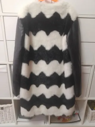 Elegante abrigo con diseño de zig-zag en pelo sintético y mangas de piel. - Combinación de blanco y negro. - Cierre de cremallera. - Bolsillos laterales.