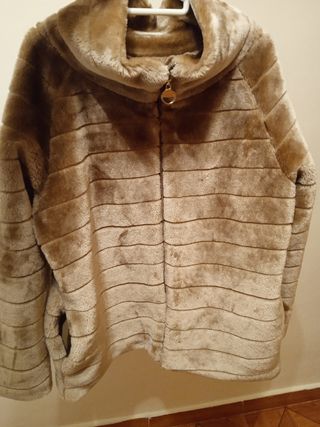 Talla 13-14 (164 cm). Color beige y un poco salmón. Abrigo de pelo sintético muy suave y calentito, con capucha. - Material: Pelo sintético. - Diseño: Con capucha. - Cierre: Cremallera.