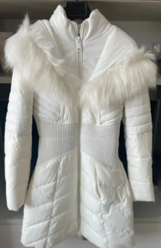 Espectacular abrigo blanco con detalles de pelo en la capucha. Superentallado y muy sexy . Comprado y guardado en armario. Precio en tienda 240 €. Envío por INPOST para precio reducido en envío. O entrega en mano en VALLADOLID. - Diseño acolchado. - Cintura elástica acanalada. - Cierre de cremallera frontal. - Capucha con ribete de pelo sintético.