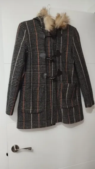 Abrigo estilo trenca con estampado de cuadros. Cuenta con capucha. - Diseño de cuadros en tonos grises y marrones. - Cierre con botones de madera y trabillas. - Bolsillos frontales. - Capucha con borde de pelo sintético.