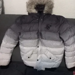 Abrigo acolchado con un diseño degradado de gris a blanco. La capucha está adornada con pelo sintético. - Cierre de cremallera y botones a presión. - Dos bolsillos delanteros con solapa y botón. - Logo de SikSilk bordado en el pecho.