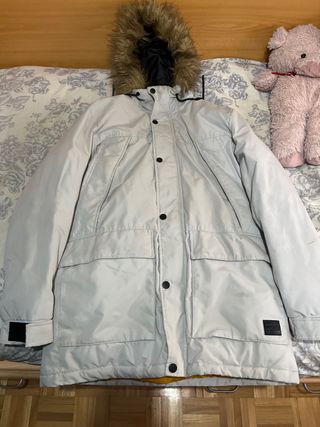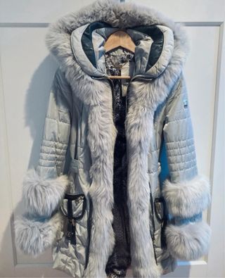 Abrigo acolchado plateado con capucha. Talla 13/14 pero sirve para adulta como una S o XS - Diseño moderno y brillante. - Capucha con detalle de pelo sintético negro. - Cierre de cremallera frontal. - Bolsillos laterales con cremallera.