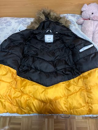 Abrigo de plumas con un acabado brillante y moderno. Cuenta con un diseño acolchado que ofrece calidez y estilo. - Capucha con ribete de pelo sintético. - Puños elásticos. - Cierre de cremallera frontal. - Detalle de parche con diseño de oso. - Medidas: altura sin contar capucha:65cm, Ancho:50cm, Hombro a hombro:44cm, Mangas:67cm.