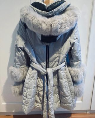 Abrigo acolchado de plumas con capucha y detalles de pelo sintético. - Cierre de cremallera frontal. - Cinturón ajustable. - Bolsillos con cremallera. Pequeño desconchon del uso en cinturón y boton del puño como se observa en las fotos
