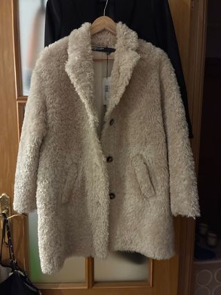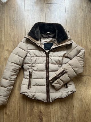 Abrigo de Zara marron, largo tres cuartas, entallado en la cintura y ajustable con pelo sintetico en el cuello, cierre con cremallera y corchetes, dos bolsillos exteriores. Usado un par de veces.