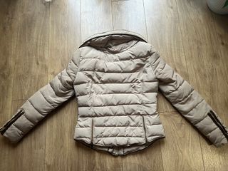 Cazadora de mujer corta y entallada de color Beige con cremalleras doradas en los dos bolsillos exteriores y en los puños y parte de los costados, con pelo sintetico en el cuello de color Wengue, capucha oculta. Talla S se ha usado 2 veces.