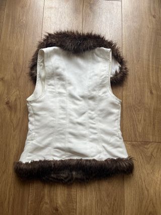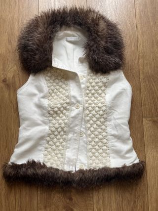 Chaleco de antelina blanco con detalle bordado por delante, con cierre de botones blancos; entallado, tiene trabillas para ponerle cinturon y detalle de pelo sintetico en borde inferior y cuello. Sin uso.