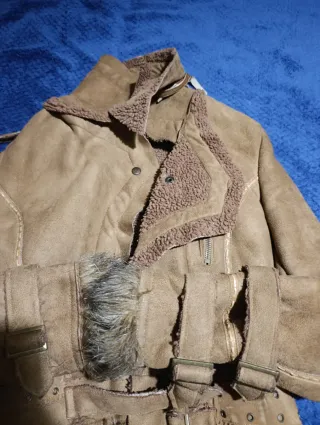 Abrigo estilo aviador con un diseño moderno y cálido. - Exterior en material similar al cuero. - Forro interior de pelo sintético color beige. - Cuello amplio con acabado de pelo. - Cierre frontal asimétrico con cremallera. - Puños y bajo con detalle de pelo. - Cinturón ajustable en el bajo.
