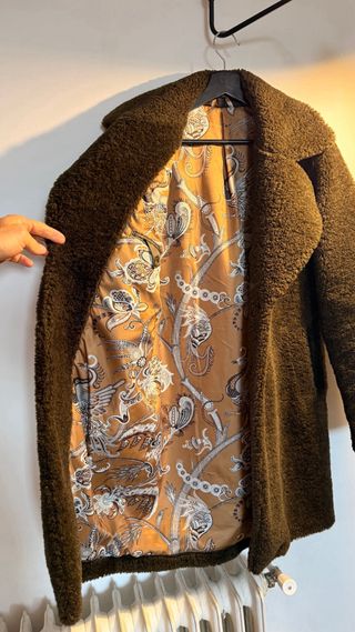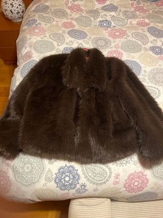 Abrigo de pelo sintético en color marrón, sin usar y en perfecto estado. - Diseño de pelo rizado. - Forro interior con estampado. - Cierre de botón.