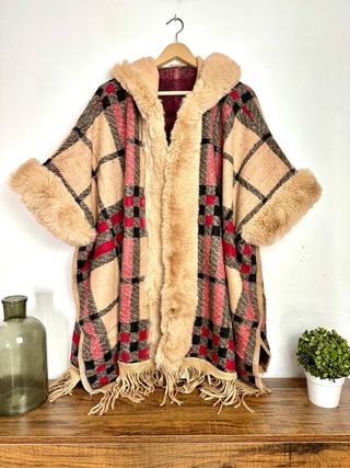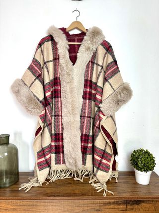Poncho con estampado de cuadros y detalles de pelo sintético, estilo boho. - Diseño con capucha. - Ribete de pelo sintético en capucha y frontal. - Mangas abiertas. - Flecos en el bajo.