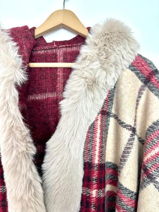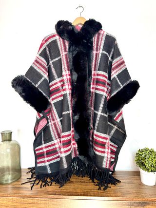 ✨ Detalles – Capucha amplia con ribete de pelo sintético – Estampado de cuadros clásicos – Pelo sintético suave en frontal y mangas – Flecos en el bajo – Diseño abierto, cómodo y envolvente – Estilo bohemio invernal 🧶 Materiales – Tejido cálido tipo manta – Pelo sintético 🎁 Ideal para – Looks de invierno – Climas fríos – Uso diario o ocasiones casual chic – Regalo original