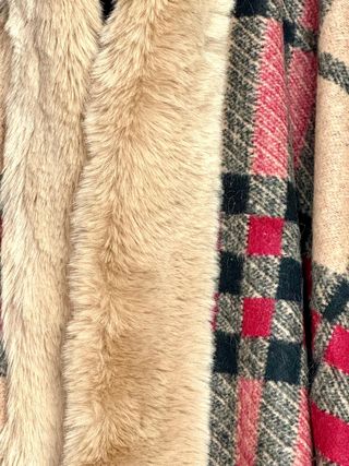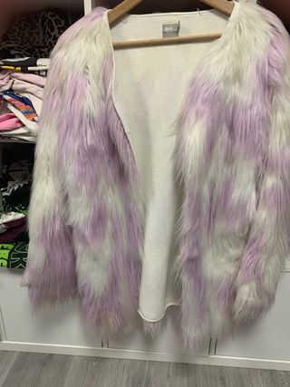 Abrigo de pelo sintético con un diseño llamativo en blanco y lila. Es una prenda suave y con mucho volumen. - Diseño de pelo largo. - Abertura frontal. Marca Asos , sólo usado una vez , es xs, pero puede valer para una S , a mi me queda pequeño porque tengo una M.