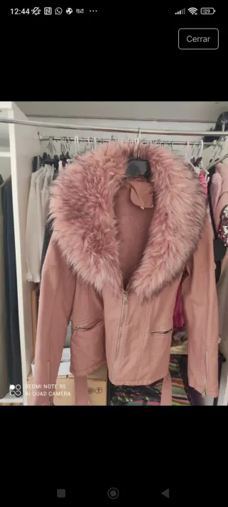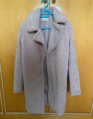 Elegante chaquetón rosa con un tacto muy suave. Usado solo una vez pero está totalmente nuevo y me ha quedado pequeño pero es ideal ademas del color, su textura y largura. Tallas aproximadas: Largo: 86cm Largura hombro 96cm Cadera:47cm
