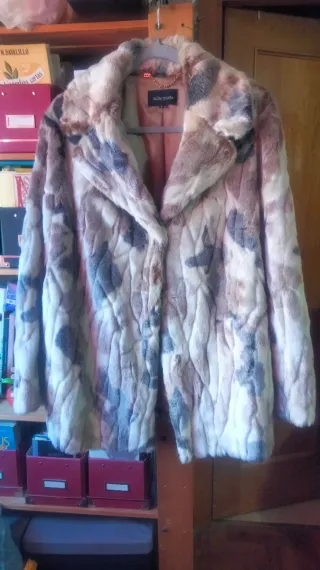 Abrigo de pelo sintético muy suave Aunque pone talla M da para una 44/46. Cierre de corchetes. Bolsillos laterales. Medidas: Hombros 45 Largo 75 Ancho 60