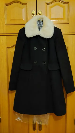 Elegante abrigo negro con un suave cuello de pelo sintético. Entallado a la cintura y falda acampanada, muy favorecedor. - Diseño de doble botonadura. - Bolsillos laterales muy cómodas para mantener las manos calientes. - Forro interior con botón de repuesto.