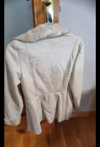 Abrigo de Bershka en color beige, con un diseño moderno y cálido, en perfecto estado, apenas usado. - Cuello con pelo sintético extraible. - Cierre de botones y cremallera. - Bolsillos frontales.