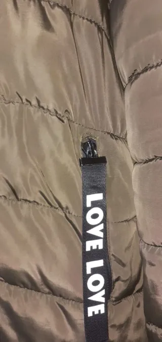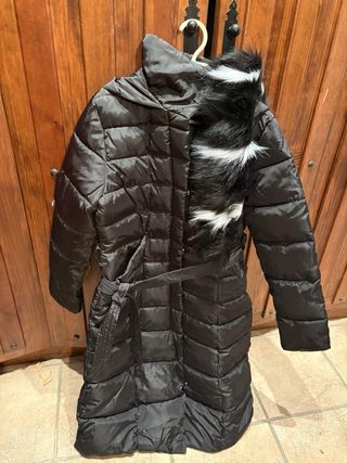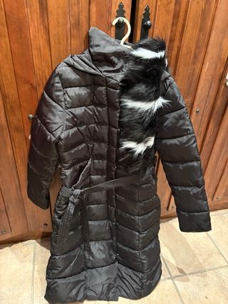 Abrigo largo talla 48 de estilo acolchado con detalles llamativos. - Cremallera frontal con tirador de cinta LOVE LOVE. - Bolsillos laterales con cremallera y tirador de cinta LOVE LOVE. - Capucha con ribete de pelo sintético. Pequeño cosido en un bolsillo (foto), por lo demas perfecto. Muy calentito. Largo: Por debajo de las rodillas. Muy pocas puestas y limpio de tintorería. No hago envíos. Venta, Intercambio, Cambio, Trueque