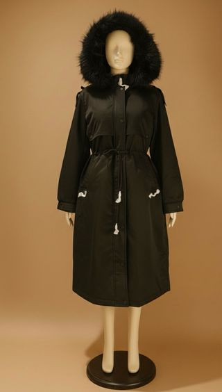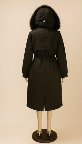 Abrigo largo estilo parka con un diseño moderno y detalles llamativos. - Capucha con ribete de pelo sintético. - Cintura ajustable con cordón. - Cierre de botones. - Bolsillos frontales con detalle. - queda en la talla S y talla XXL