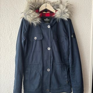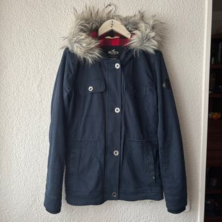 Abrigo en color azul marino con detalles en rojo de la marca Hollister Talla M La capucha está adornada con pelo sintético extraíble. Cierre de botones. Bolsillos frontales con solapa. Forro interior a cuadros. En perfecto estado 🖤 🔴 Pásate por mi perfil, cositas desde 1€ ⚫️ Llévate un descuento comprando más de dos artículos 🔝 ⚠️ Urge venta por mudanza ⚠️
