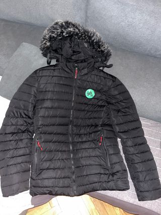 Abrigo Columbia negro con capucha. - Diseño acolchado. - Capucha con detalle de pelo sintético. - Cierre frontal. (Negociable)