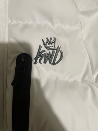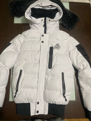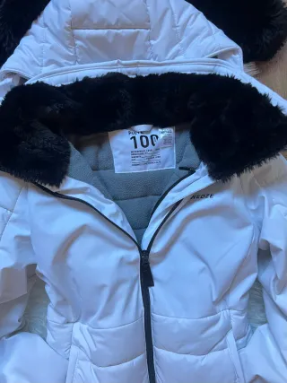 Abrigo blanco con detalles en negro, ideal para la nieve. - Capucha con pelo sintético. - Cierre de cremallera. - Bolsillos laterales. -Es XXS pero funciona perfecto para una XS