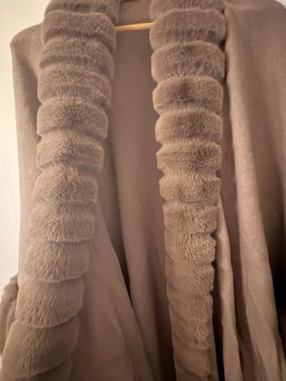 Elegante capa de invierno con un suave acabado y detalles de pelo sintético. - Diseño abierto. - Puños con pelo sintético. - Cinturón para ajustar.