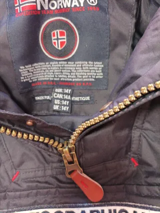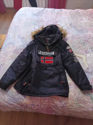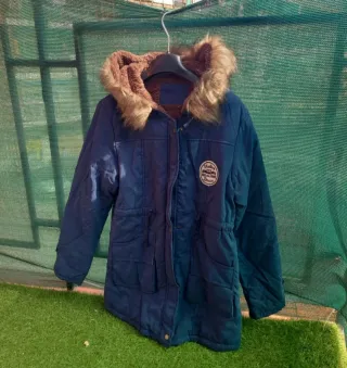 Abrigo de la marca Geographical Norway en color azul. Estilo canguro. Talla 14 años. - Diseño con capucha y pelo. Pelo se puede quitar. - Bolsillo frontal. - Cierre de cremallera en un lateral.