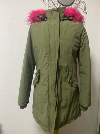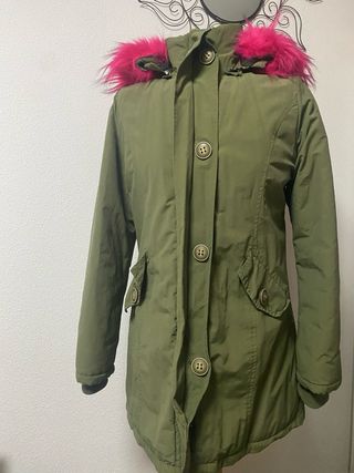 Abrigo acolchado de color verde con detalles de pelo en color fucsia. Impecable. - Capucha con pelo. - Cierre de cremallera y botones. - Bolsillos delanteros con botón. - Puños elásticos. - Lleva borreguito en la parte interior hasta la cintura y en la capucha. - Talla grande. Marca una talla S, pero talla, como una M. - Se ha usado muy poco y está impecable. Ningún defecto