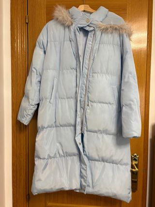 Abrigo largo de color beige, perfecto para el frío. - Capucha con detalle de pelo. - Diseño acolchado. - Cierre de cremallera.