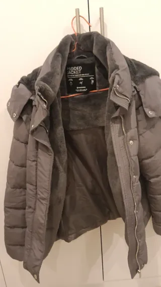 Abrigo acolchado de color gris, perfecto para mantenerte abrigado. - Diseño acolchado. - Forro interior de pelo sintético. - Cuello alto con detalle de pelo.