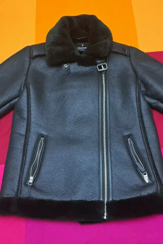 Chaqueta de estilo aviador con forro de pelo. - Cierre de cremallera. - Bolsillos con cremallera. - Cuello de pelo. - Puños y bajo con detalle de pelo. - talla S Nueva con etiqueta Se recoge en loeches o hago envios