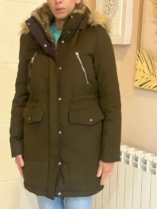 Abrigo de la marca Zara, en color verde y sin estrenar. Es una prenda de abrigo con capucha y detalles de cremalleras. - Capucha con pelo. - Cierre de cremallera y botones. - Bolsillos con cremallera. - Cintura ajustable.