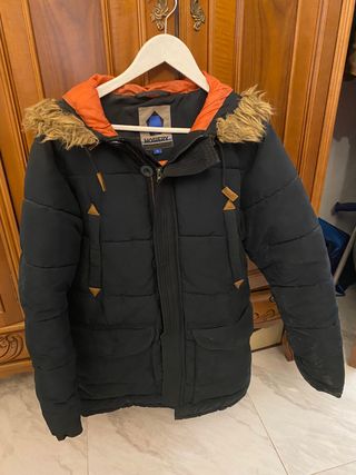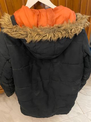 Chaqueta de invierno con capucha y forro naranja. - Cierre de cremallera. - Bolsillos delanteros con solapa. - Detalle de pelo en la capucha. - Puños acanalados.