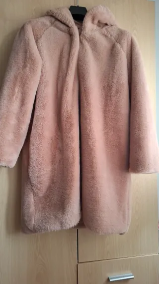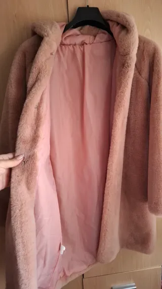 Abrigo rosa ,de pelo, con capucha,tiene forro.