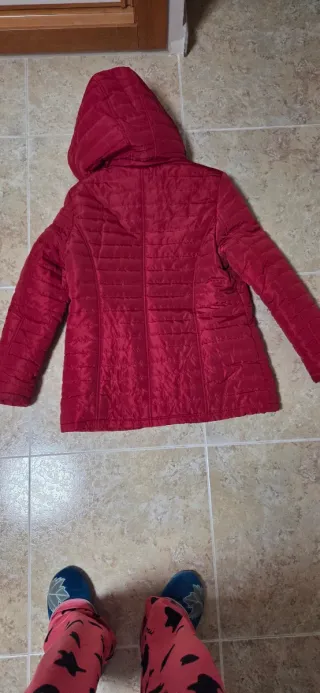 Abrigo rojo de interior de completo incluida la capucha. - Cierre de botones de cochertes y cremalleras. - Bolsillos laterales con cremallera. - Diseño acolchado. Medidas en foto ya que equivale más a una l. Dos puestas