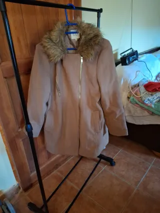 Abrigo de pelo en tono beige,marca Pull&Bear talla M( puesto por niña 13 años que mide 160cm).Largo 56cm, ancho en sisa 57cm y largo de manga 56cm( desde costura)Puños con elastico, cierra con cremallera plateada, dos bolsillos delanteros. Se ve sin compromiso