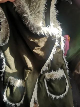 Chaleco de pelo y ante en color caqui. Un diseño muy bonito y original. - Detalle de pelo blanco en el cuello y los bolsillos. - Cierre abierto.