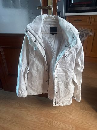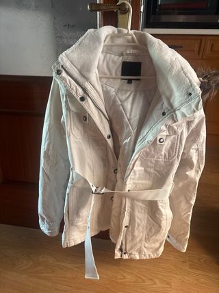Abrigo blanco con capucha, ideal para el frío. - Cierre de cremallera y botones. - Bolsillos frontales. - Cuello forrado de pelo sintético.