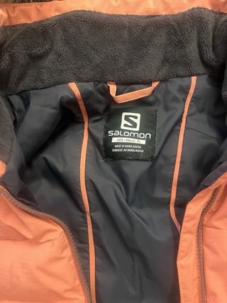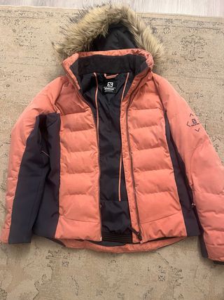 Chaqueta de esquí para mujer de la marca Salomon, con un diseño moderno y funcional. - Capucha con pelo sintético. - Paneles laterales en contraste. - Cremallera frontal completa. - Logo de la marca en la manga.