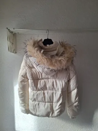 Abrigo de poli piel/pelo. Beige. Corto con capucha.LA talla es Xs pero como si fuera 36/38 ya que talla ancho