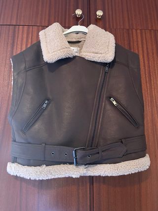 Chaleco de borrego con cuello y bajo de pelo sintético. - Diseño tipo aviador. - Cierre de cremallera asimétrica. - Cinturón con hebilla. - Bolsillos frontales con cremallera.