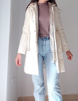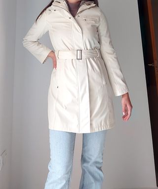 Abrigo impermeable color blanco roto, con chaleco interior de pelo que se puede quitar, bolsillos laterales con cremallera, cinturón con hebilla. Talla xs, es fino pero abriga mucho. Muy poco usado, está nuevo. Lo vendo porque me está justo. ¡No incluye capucha!