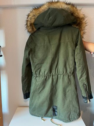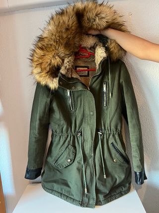 Abrigo estilo parka en color verde, ideal para el frío. - Forro interior de borreguito para mayor calidez. - Capucha con pelo. - Bolsillos frontales con solapa y cremallera. - Cierre de cremallera y botones. - Cordón ajustable en la cintura.