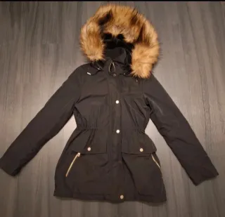 Abrigo de Zara en color negro, talla XS. Perfecto para el frío. - Capucha con pelo. - Cintura ajustable. - Bolsillos con cremallera.