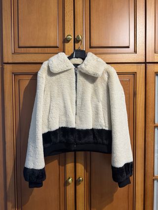 Abrigo de pelo sintético con un diseño moderno y bicolor. Perfecto para añadir un toque de estilo a tus looks. - Parte superior en color beige. - Parte inferior y puños en color negro. - Cierre de cremallera frontal. - Cuello estilo bomber.