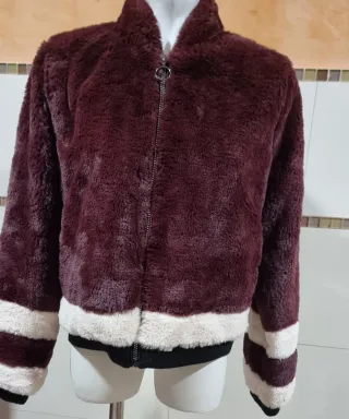 Abrigo corto de pelo sintético para mujer. - Diseño bomber. - Cierre de cremallera. - Puños y bajo con detalle de rayas. -color burdeos -con muy poco uso