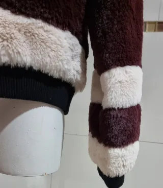 Chaqueta de pelo sintético en color marrón. Talla 42 pero podría ser entre una 40 y una 42. Es una prenda cómoda y cálida. Usada en 1 ocasión. El precio original fué de 98 euros. - Cierre de cremallera dorada. - Cuello alto.